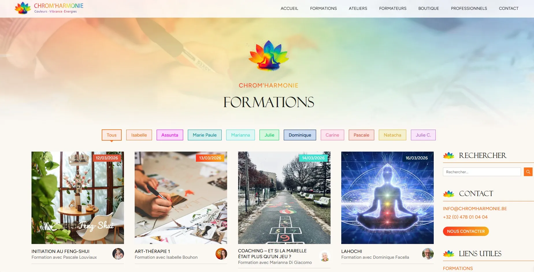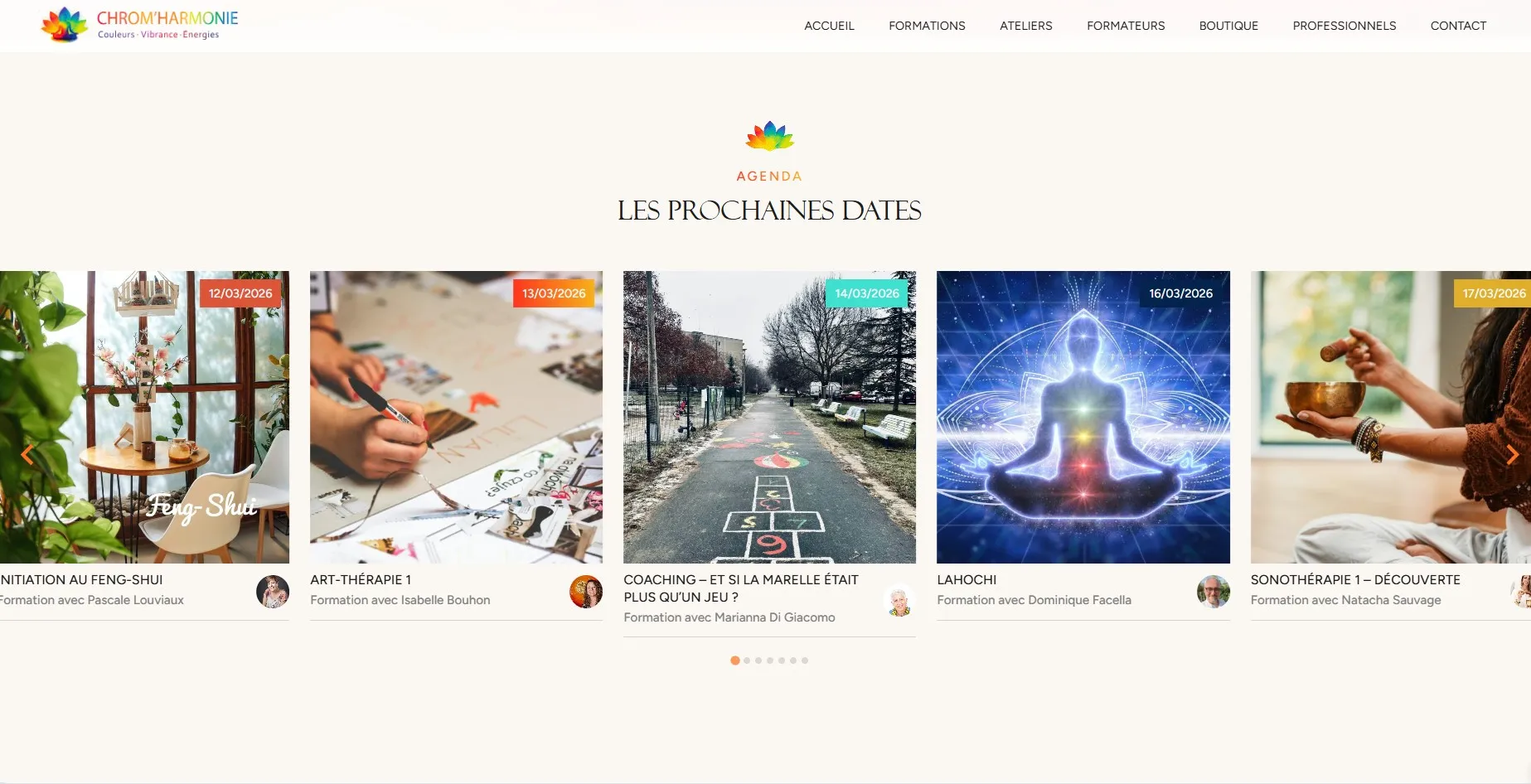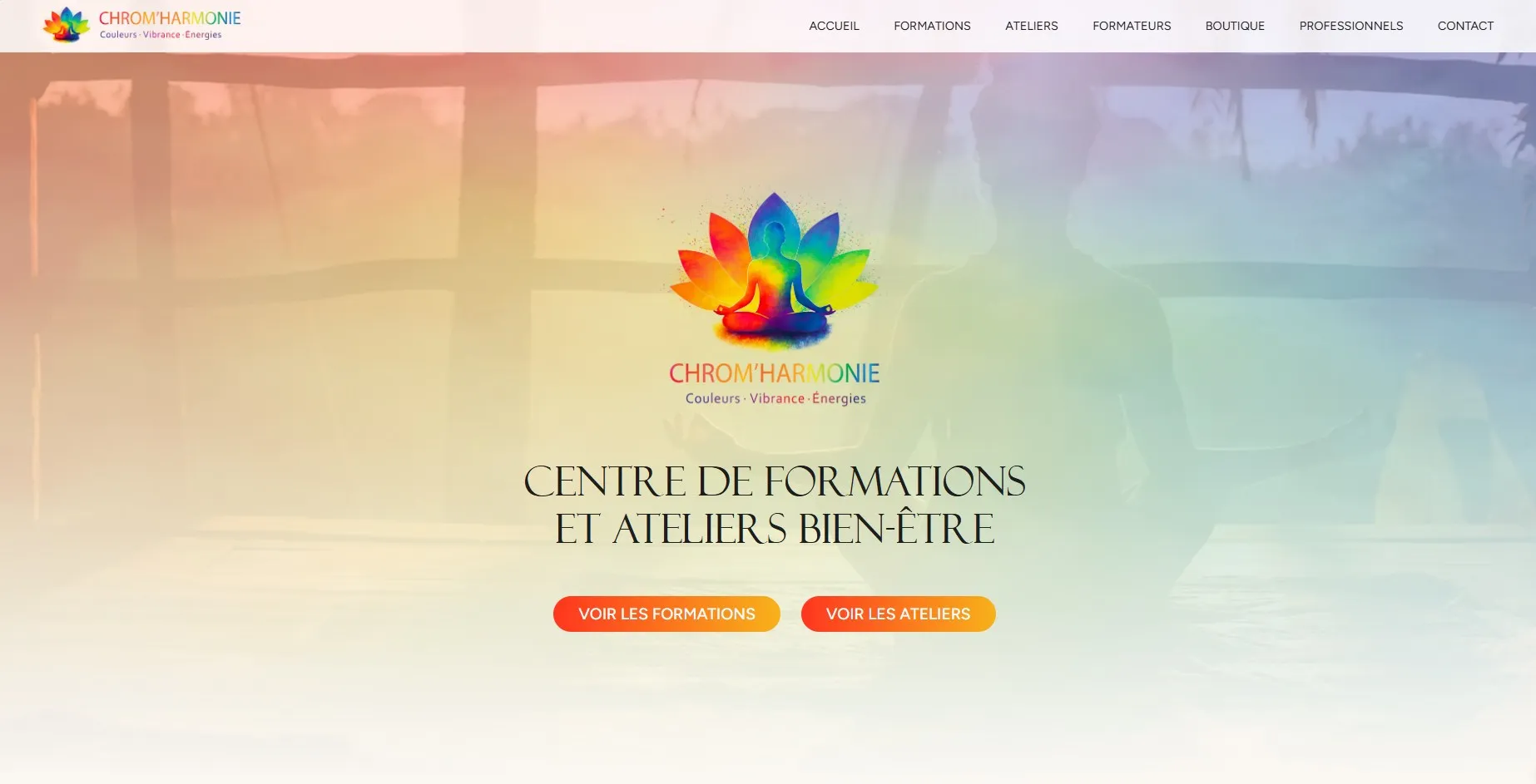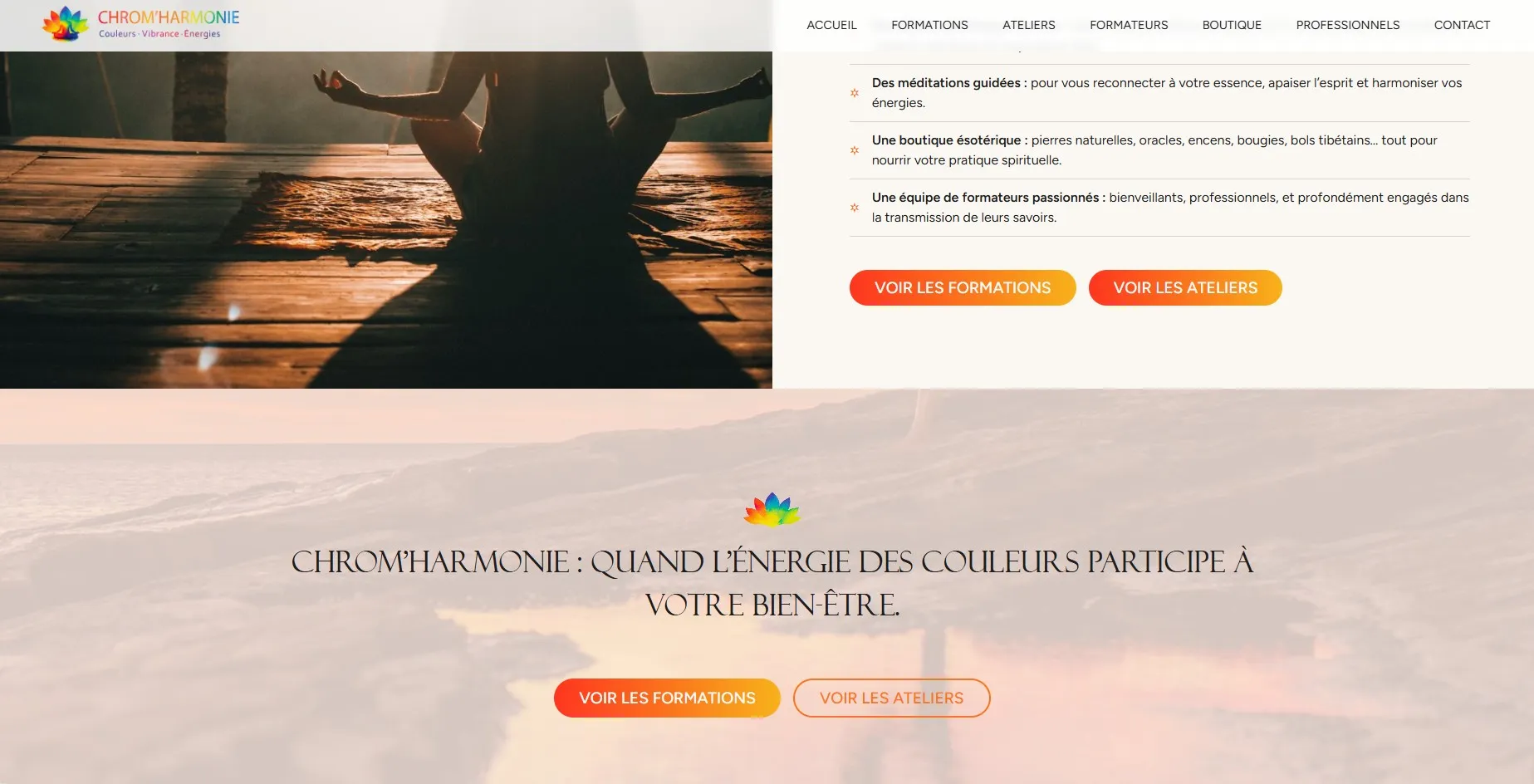 Le site Chrom’Harmonie est le fruit d’une deuxième collaboration avec Isabelle Bouhon, qui m’a à nouveau fait confiance après la création de son site artistique Chrom’Art. Conçu pour refléter l’univers harmonieux du centre, il met en avant les formations certifiantes, les ateliers bien-être et une équipe pédagogique passionnée, avec réservation et paiement en ligne pour une expérience fluide et professionnelle.