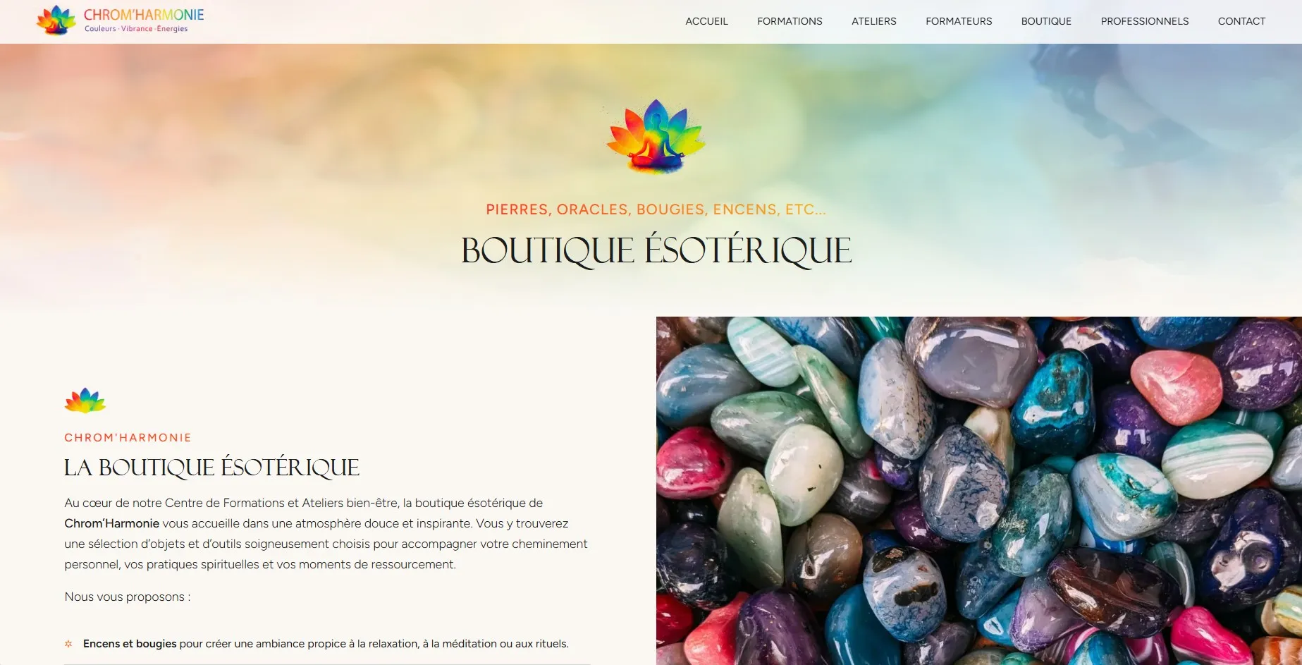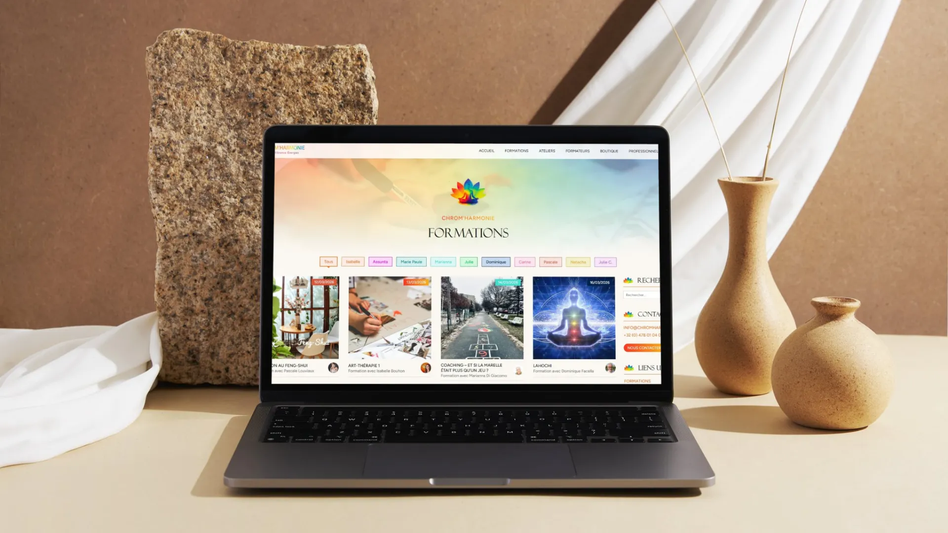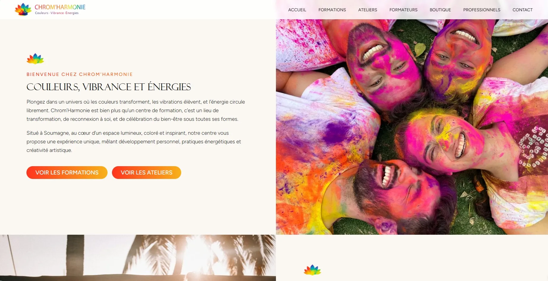 Le site Chrom’Harmonie est le fruit d’une deuxième collaboration avec Isabelle Bouhon, qui m’a à nouveau fait confiance après la création de son site artistique Chrom’Art. Conçu pour refléter l’univers harmonieux du centre, il met en avant les formations certifiantes, les ateliers bien-être et une équipe pédagogique passionnée, avec réservation et paiement en ligne pour une expérience fluide et professionnelle.