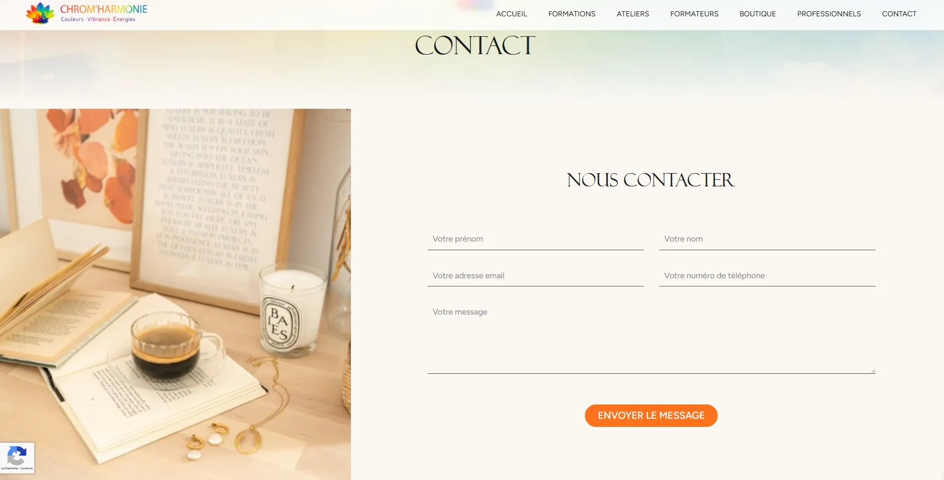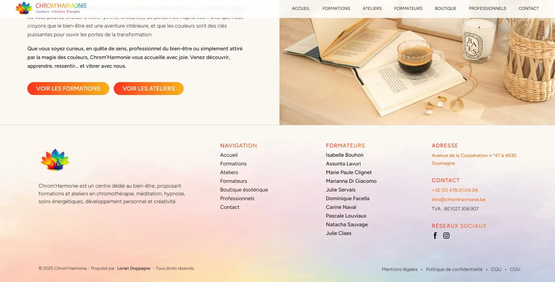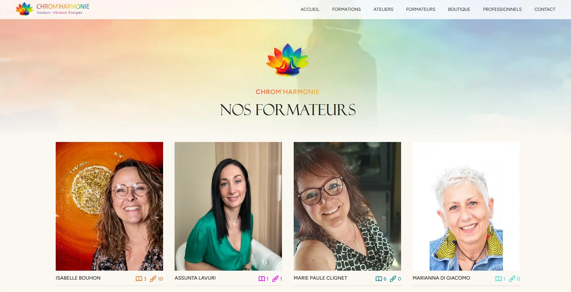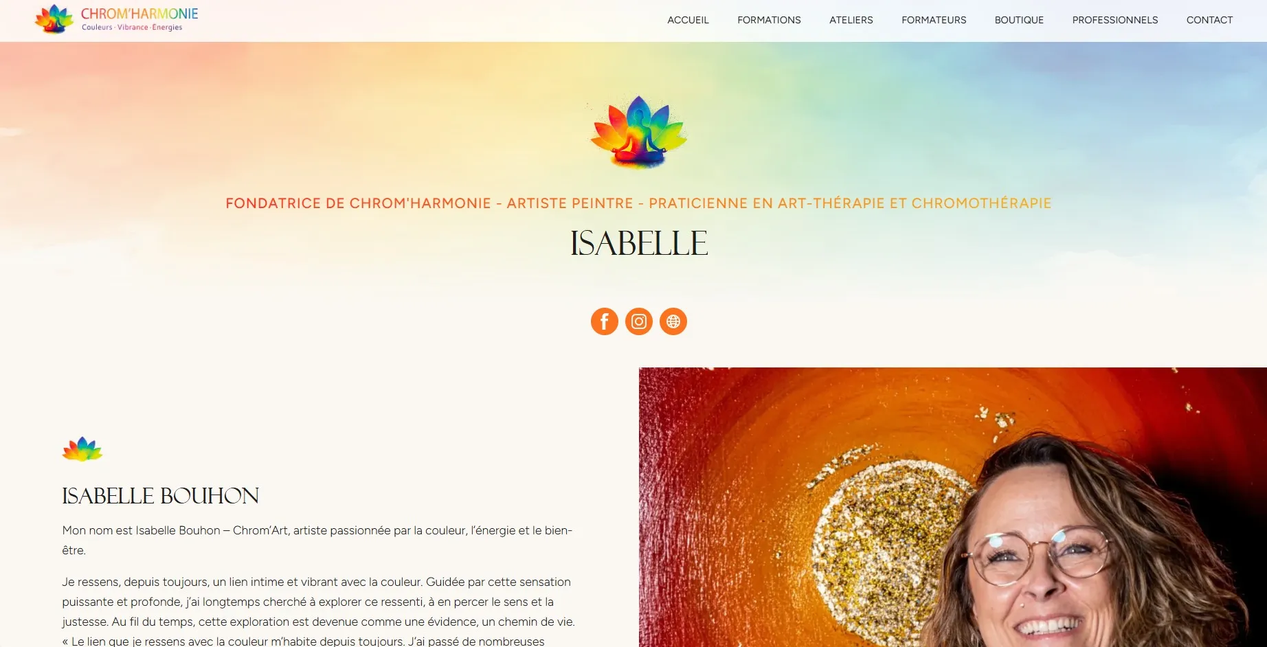 Le site Chrom’Harmonie est le fruit d’une deuxième collaboration avec Isabelle Bouhon, qui m’a à nouveau fait confiance après la création de son site artistique Chrom’Art. Conçu pour refléter l’univers harmonieux du centre, il met en avant les formations certifiantes, les ateliers bien-être et une équipe pédagogique passionnée, avec réservation et paiement en ligne pour une expérience fluide et professionnelle.