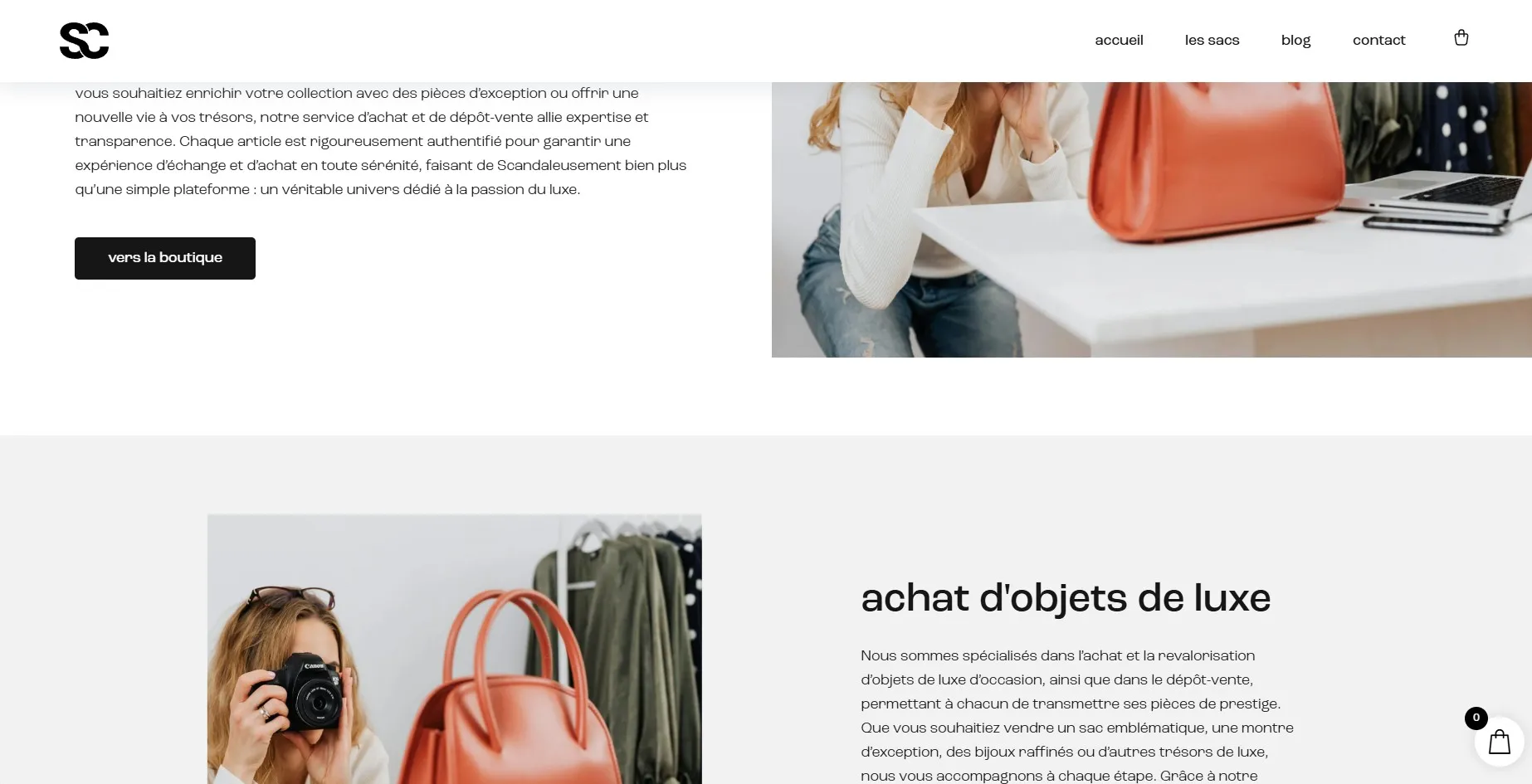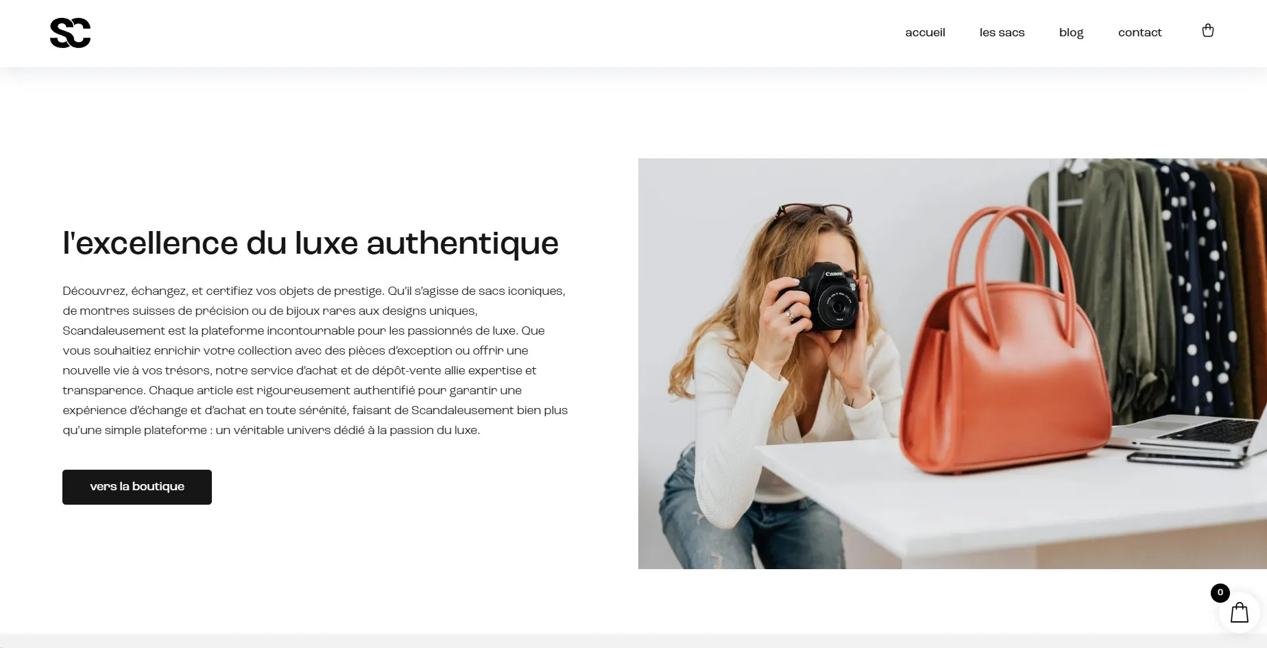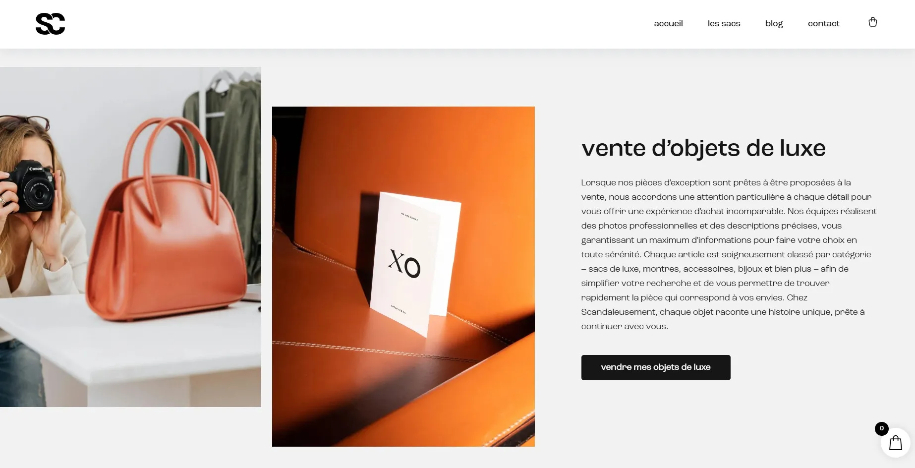Le site Scandaleusement propose un design épuré et raffiné, respectant pleinement les codes du luxe. Chaque élément graphique a été pensé pour valoriser les sacs de luxe d’occasion et renforcer l’image premium de la marque.