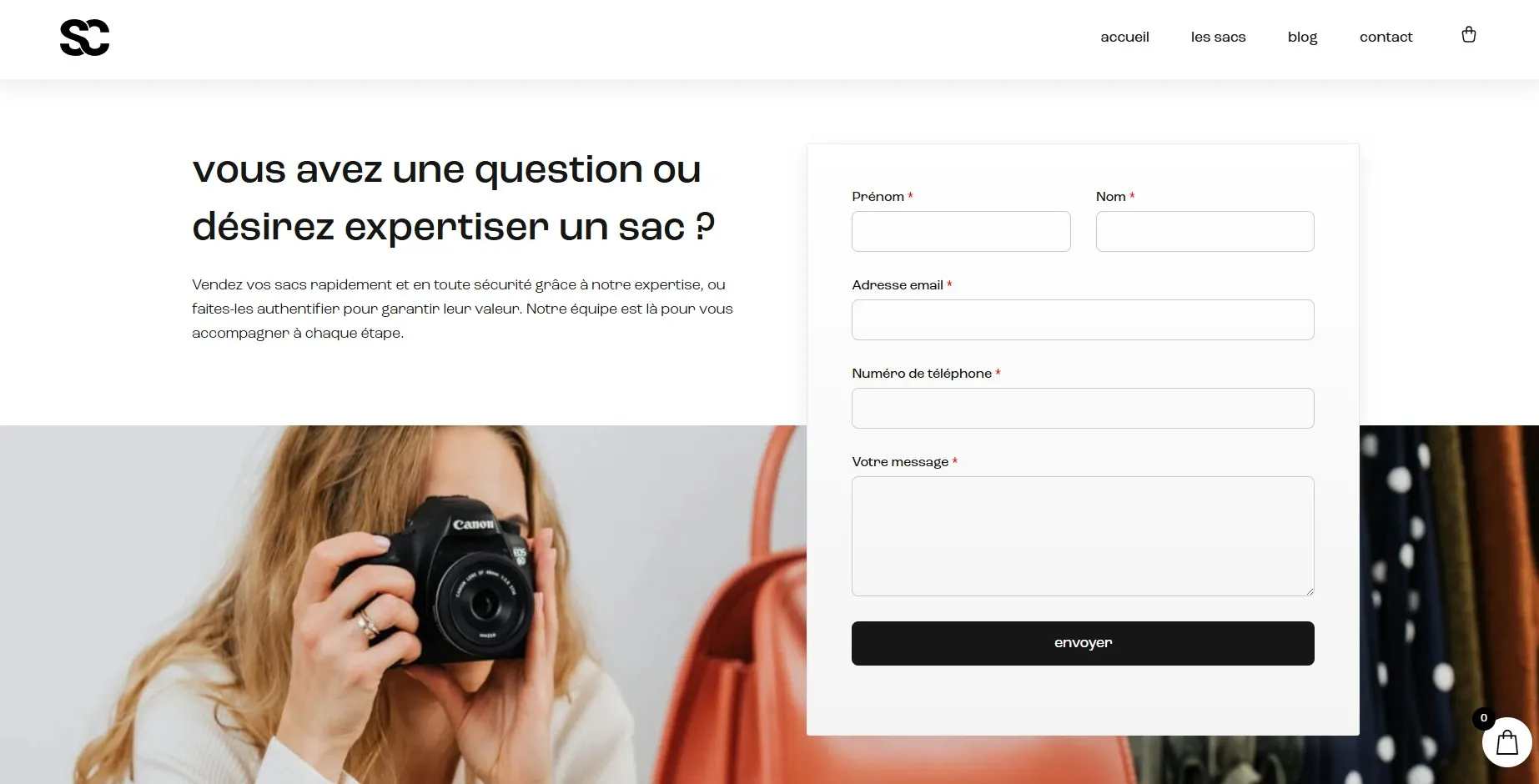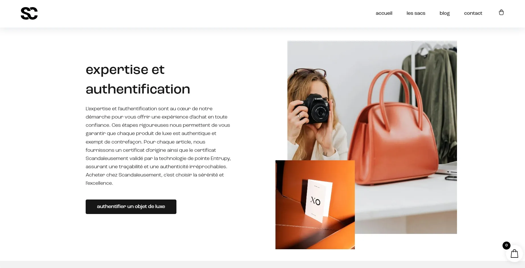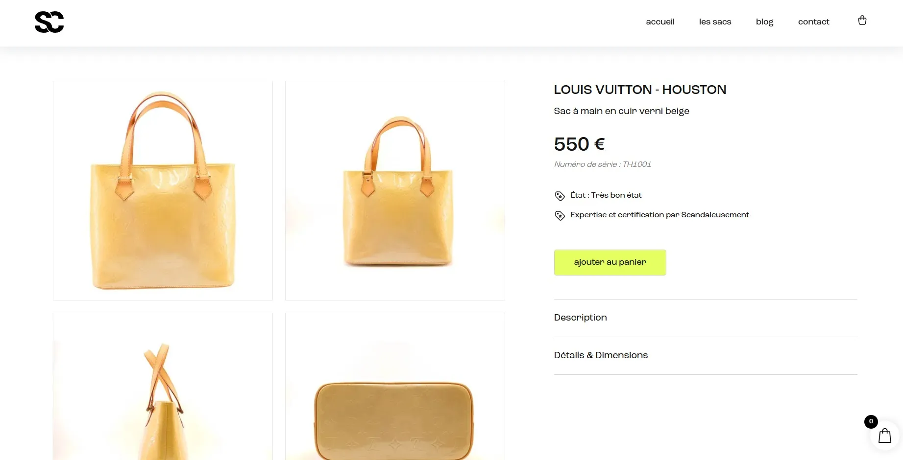 Le site Scandaleusement propose un design épuré et raffiné, respectant pleinement les codes du luxe. Chaque élément graphique a été pensé pour valoriser les sacs de luxe d’occasion et renforcer l’image premium de la marque.