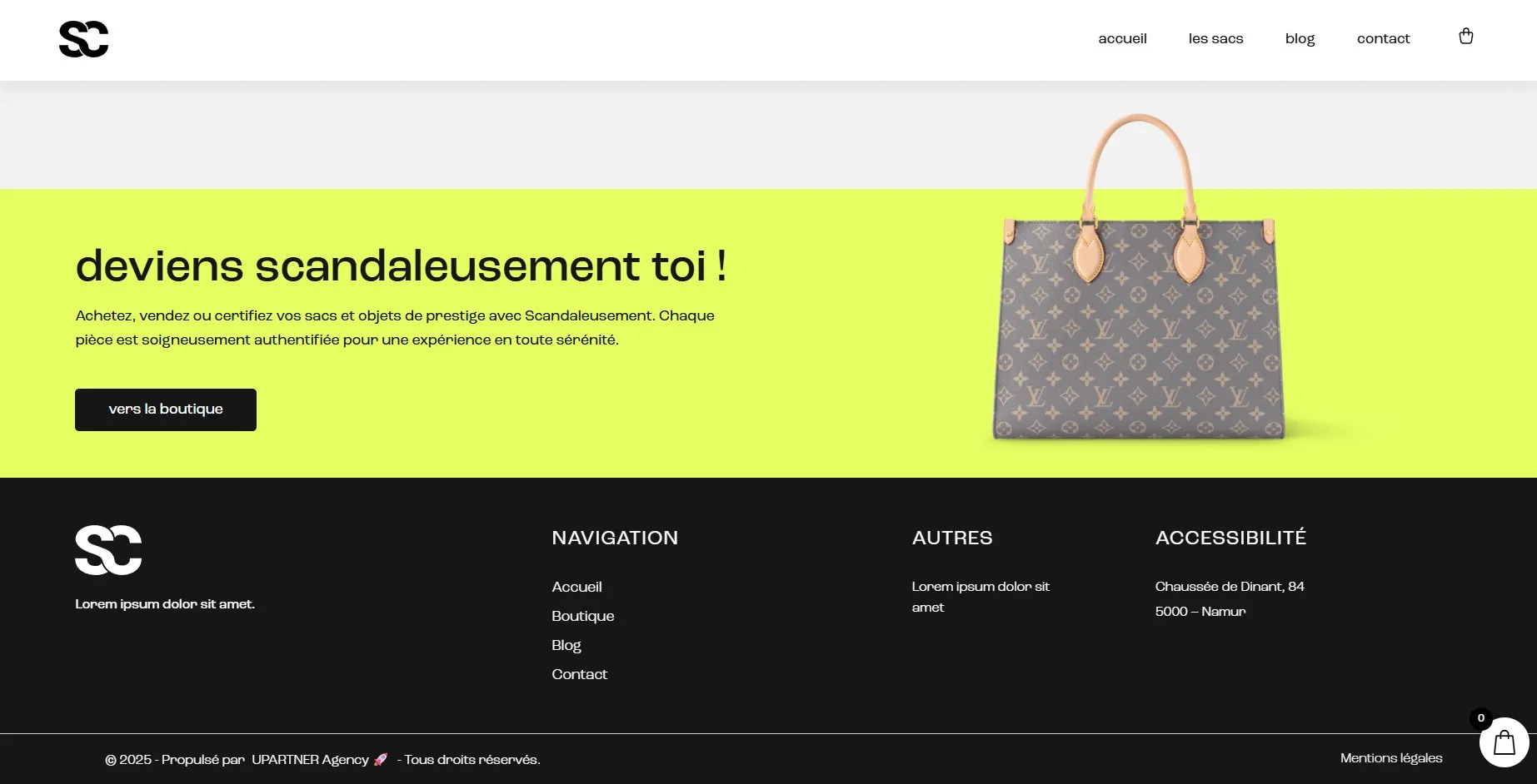 Pour lancer sa présence en ligne, Scandaleusement a été conçu sur mesure en respectant les codes du luxe. Le site allie modernité et élégance, avec un design épuré et raffiné, tout en offrant une navigation fluide et intuitive pour mettre en valeur et vendre des sacs de luxe d’occasion. Il s’agit d’un projet interne développé au sein de UPARTNER Agency. Le projet a été mis en pause et n’est pas encore finalisé.